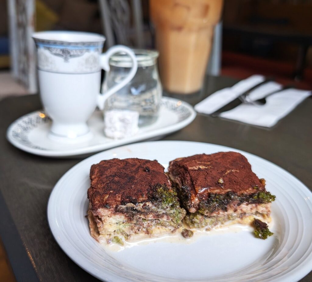 Fatma’s has also begun serving cold baklava, a relative newcomer to the menu, a dessert that’s been trending in Turkey over the past three years. Similar to traditional baklava, cold baklava or “soğuk baklava” is made from layers of crisp phyllo dough and chopped pistachio, but is soaked in a milky simple syrup, topped with a sifted layer of cocoa powder, then chilled in the refrigerator.